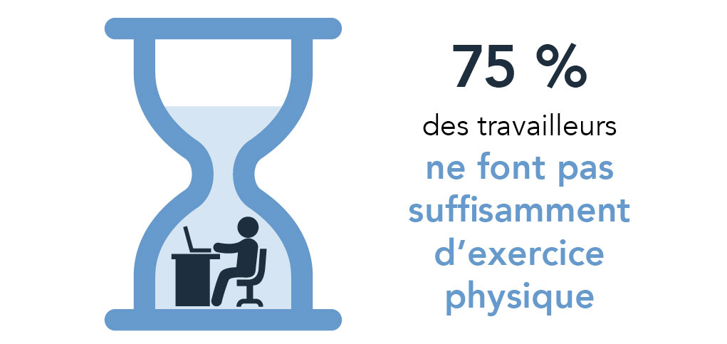 La position assise prolongée est mauvaise pour la santé. La solution : bouger plus et rester assis moins longtemps sans interruption. Pour y arriver, vous devez investir dans une culture de l’activité physique. Deux grands obstacles empêchent de pratiquer une activité physique régulière, à savoir le manque de temps (67,8 %) et l’absence de partenaire de sport (41,1 %). Le fait de bouger avec des collègues, au travail ou sur le chemin du travail, peut déjà faire beaucoup.
