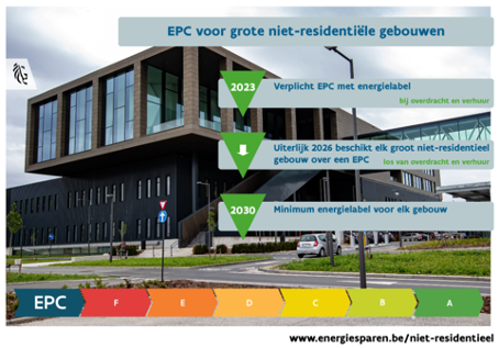 Vanaf 1 januari moeten alle gebouweenheden van publieke gebouwen, met een bruikbare vloeroppervlakte vanaf 1.000 m², een EPC voor niet-residentiële gebouwen kunnen voorleggen. Het gaat onder meer over gebouwen van scholen, internaten, welzijnsvoorzieningen, gezondheidsvoorzieningen, overheidsbedrijven en lokale besturen.