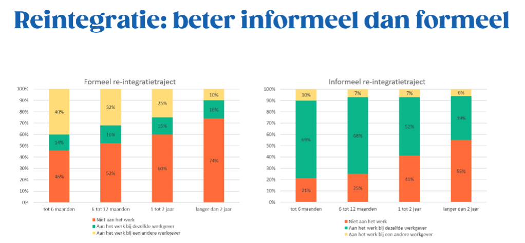 Grafiek: Informele re-integratietrajecten hebben een veel grotere slaagkans dan formele trajecten. (Bron: IDEWE & Mensura)