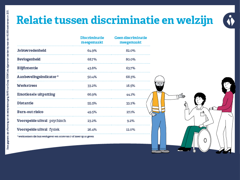 L’analyse des chiffres de l’ARPS-i, l’évaluation des risques psychosociaux menée par les experts d’IDEWE en 2021, révèle certains constats alarmants. « Le sentiment d’être discriminé au travail est plus fréquent chez les femmes et les travailleurs de moins de 45 ans. En outre, les personnes qui se sentent victimes de discrimination obtiennent des résultats bien inférieurs aux indicateurs de bien-être tels que l’engagement, la satisfaction au travail et l’intention de rester. Parallèlement, ce groupe souffre beaucoup plus des indicateurs de mal-être tels que le stress au travail et le risque de burn-out. La lutte contre la discrimination et la promotion de l’inclusion sont donc inestimables non seulement pour le bien-être des travailleurs, mais aussi pour l’équipe et l’organisation où ils travaillent. »
