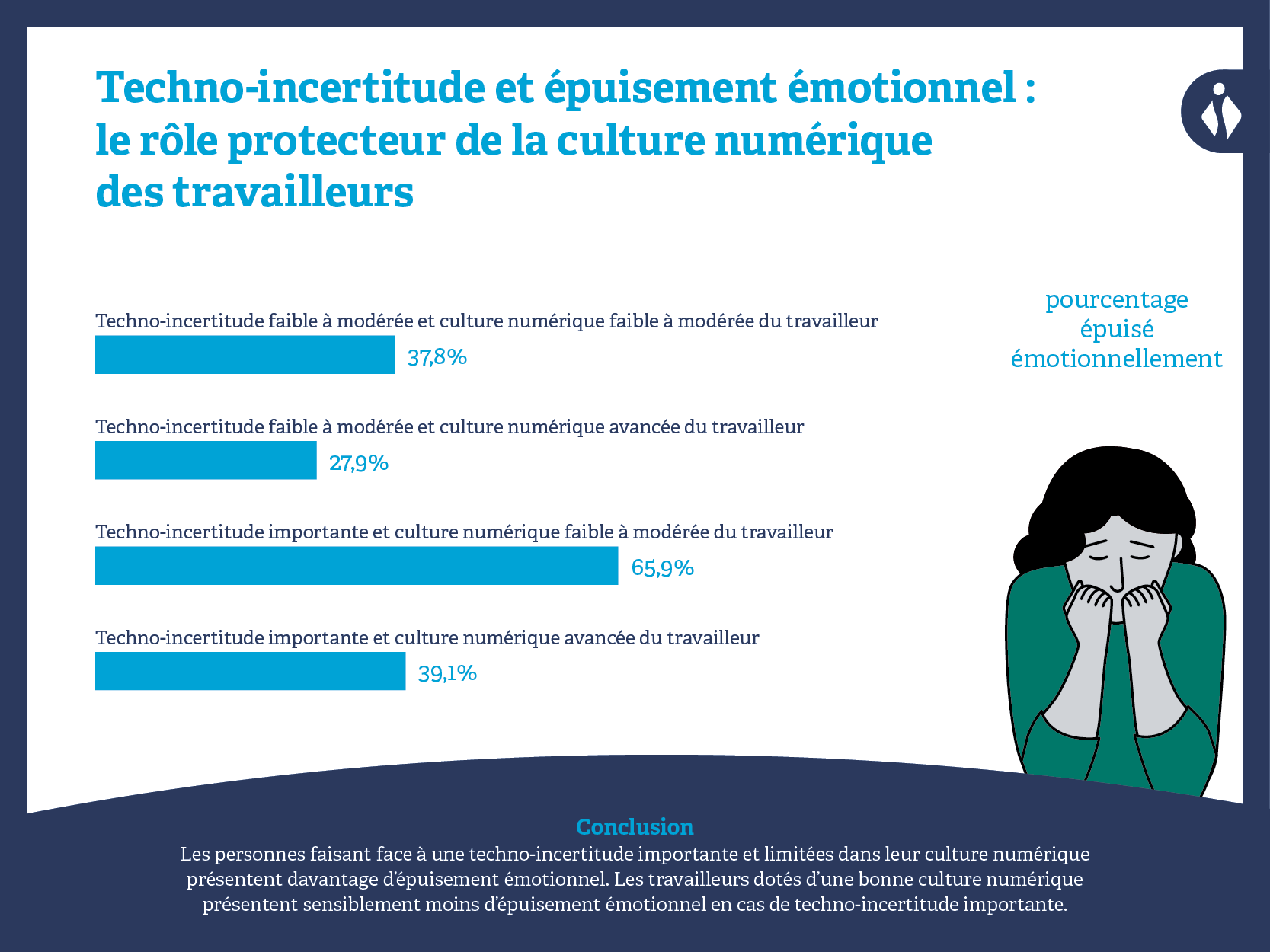 Si l’on examine la relation entre ressource et résultat, notre étude montre que les participants possédant une culture numérique souffrent moins d’épuisement émotionnel qui découlerait du techostress.
