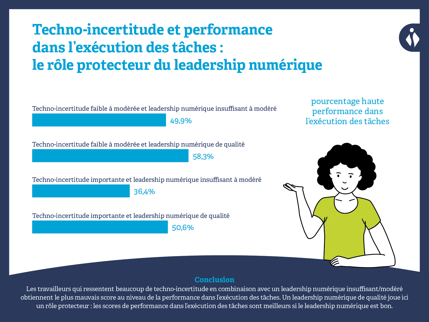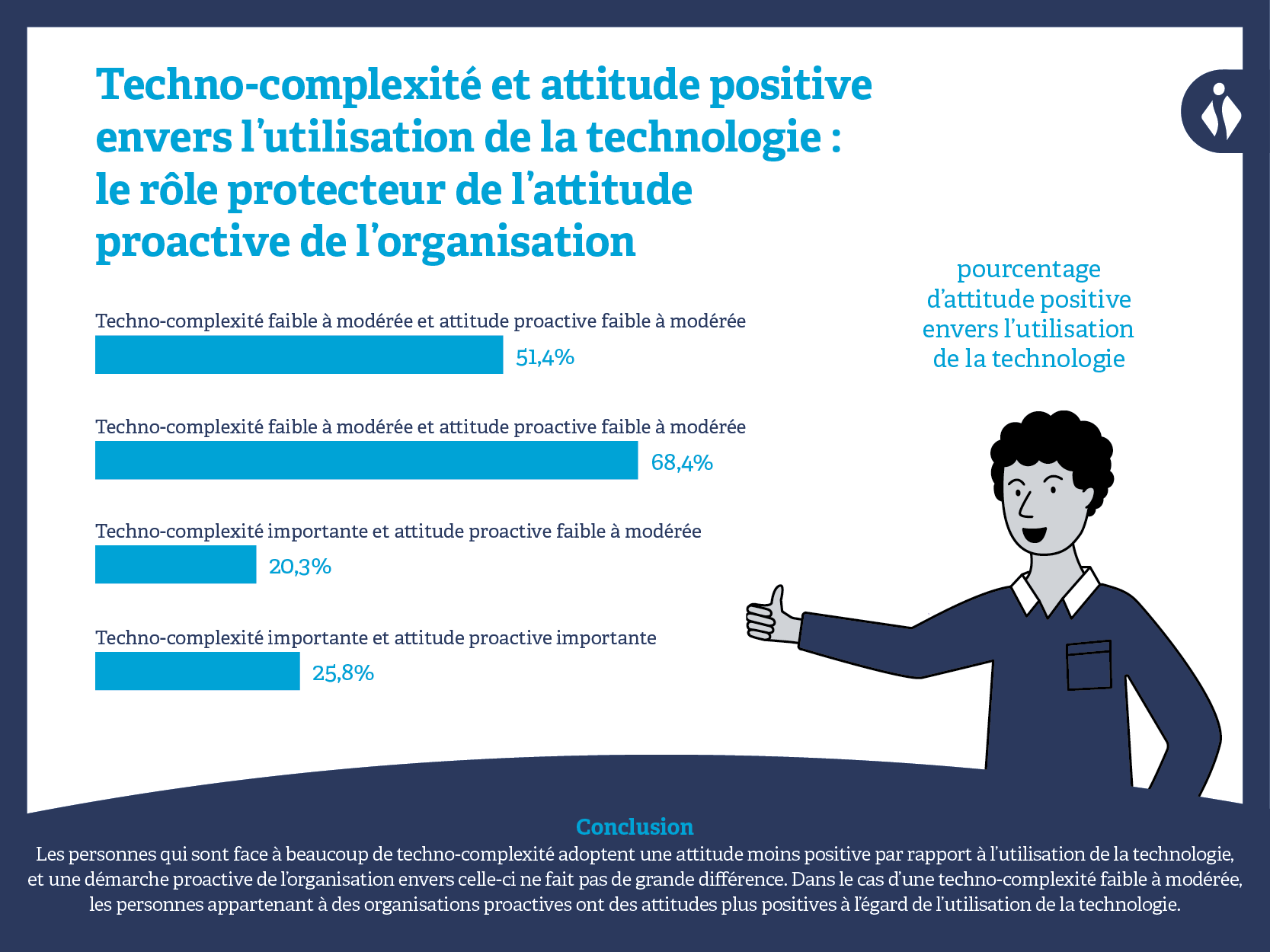 Les résultats de notre étude montrent un effet tampon de la proactivité organisationnelle à l’égard de la technologie dans la relation entre le technostress et divers résultats. En ce qui concerne la performance dans l’exécution des tâches, pour les personnes qui perçoivent la proactivité de l’employeur comme étant élevée, la différence entre les participants qui obtiennent des scores faibles et élevés en matière d’incertitude technologique n’est pas significative. Il en va différemment pour les personnes qui jugent cette proactivité faible à modérée : si elles obtiennent simultanément un score élevé en matière de techno-incertitude, elles font état d’une performance moindre dans l’exécution des tâches.