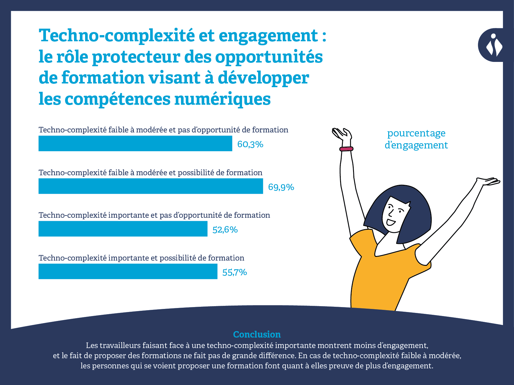 Veillez donc à vous interroger sur la réponse que donneraient vos travailleurs. En effet, dans notre enquête, les personnes qui ont eu l’occasion de bénéficier d’une formation numérique ont obtenu de meilleurs résultats. Les travailleurs à qui l’on a proposé une formation numérique affichent un épuisement émotionnel moindre, une attitude plus positive à l’égard de l’utilisation de la technologie et un engagement ainsi qu’une satisfaction accrus à l’égard de leur travail.