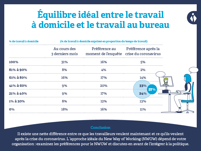 « 54 % des travailleurs à temps plein préfèrent un régime comportant deux à trois jours de travail à domicile par semaine. Mais ici aussi, se concerter est la clé. »