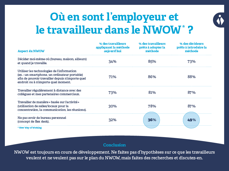 « Soyez prudents quant aux suppositions sur ce que vos travailleurs souhaitent sur le plan du NWOW. Par exemple, seul un tiers des personnes interrogées étaient prêtes à travailler dans le cadre d’un système de flex desk. »