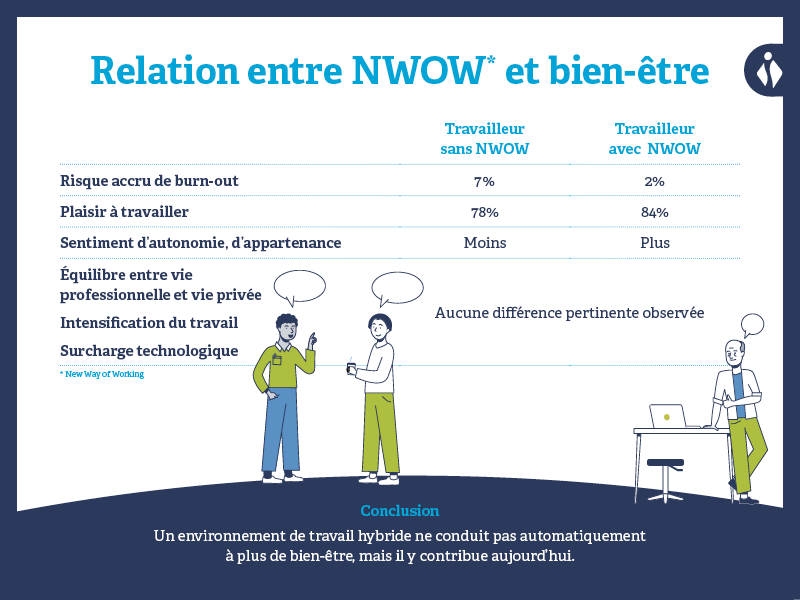 L’étude montre que les travailleurs ayant un degré élevé d’organisation du travail hybride (c’est-à-dire une organisation du travail flexible dans laquelle les travailleurs peuvent déterminer où et quand ils travaillent, tout en étant soutenus par la communication électronique) ont un risque plus faible de burn-out et éprouvent plus de plaisir à travailler. Parmi les personnes qui ne bénéficient pas ou peu d’une organisation flexible du travail, 7 % présentent un risque accru de burn-out et 78 % éprouvent du plaisir à travailler, alors que les personnes disposant d’un aménagement de travail fortement hybride obtiennent des résultats nettement meilleurs à cet égard : seulement 2 % présentent un risque accru de burn-out et pas moins de 84 % éprouvent du plaisir à travailler. L’étude révèle également que les personnes ayant un degré élevé d’organisation hybride du travail sont plus autonomes, d’une part, et ont un sentiment d’appartenance plus fort, d’autre part.