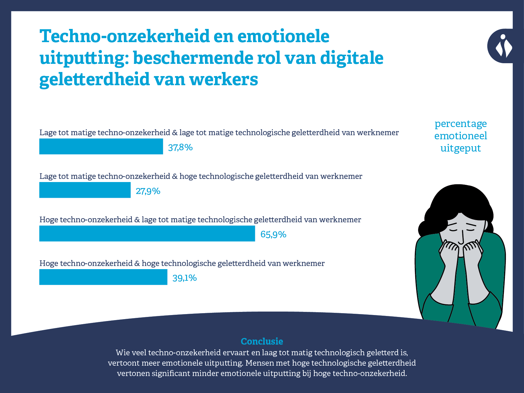 Om preciezer te zijn: als de digitale geletterdheid hoog is, is er geen significant verschil in emotionele uitputting tussen laag- en hoogscoorders op techno-onzekerheid. Is de digitale geletterdheid laag, dan scoren de personen met veel techno-onzekerheid ook significant slechter op de outcome emotionele uitputting .