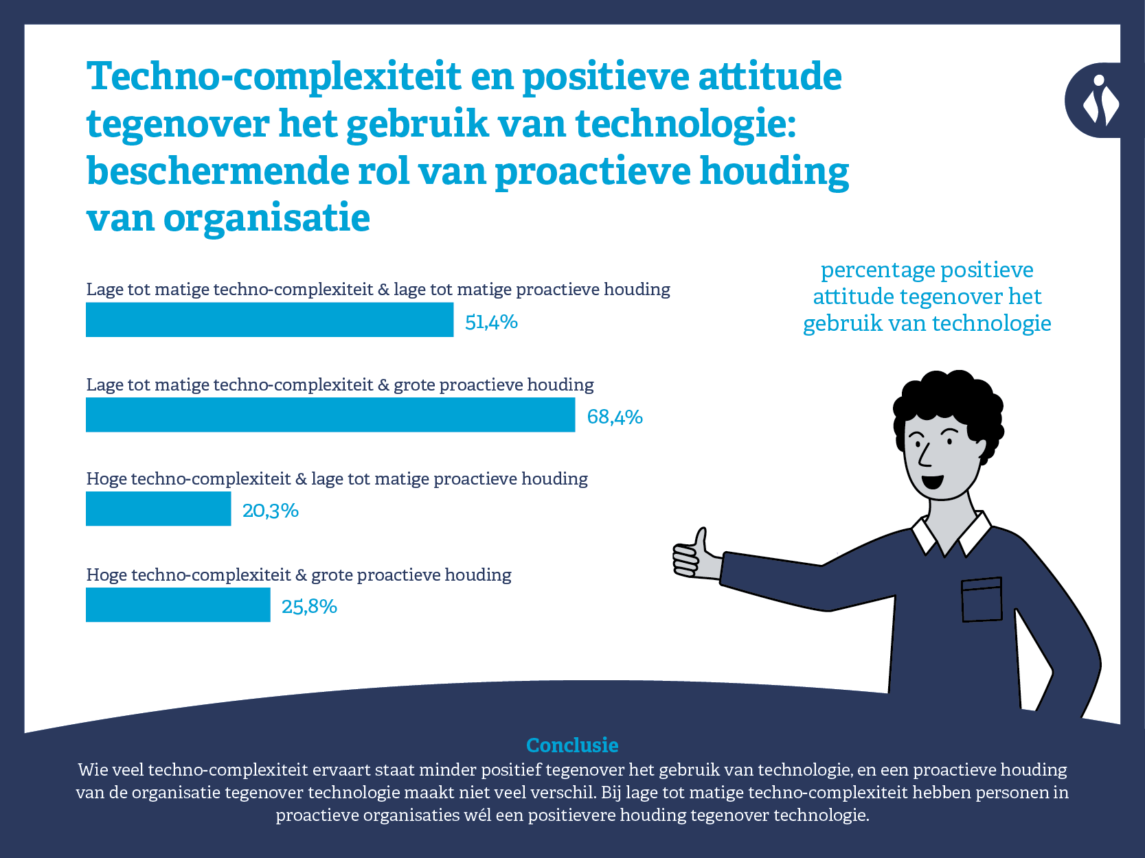 Daarnaast zien we dat personen die veel techno-complexiteit ervaren, een minder positieve houding tegenover het gebruiken van technologie vertonen, en hier lijkt een proactieve houding van de organisatie tegenover technologie niet veel aan te kunnen doen. Bij lage tot matige techno-complexiteit, staan personen in proactieve organisaties wel positiever tegenover het gebruiken van technologie . Gelijkaardige resultaten werden gevonden voor de outcomes jobtevredenheid en bevlogenheid.