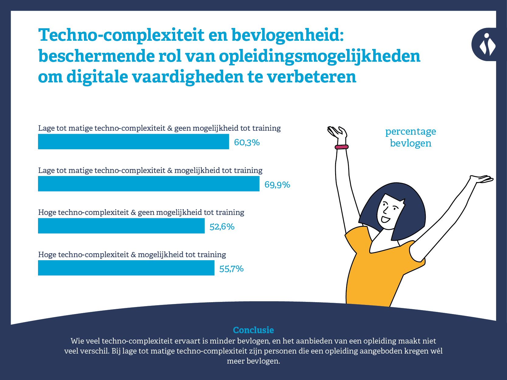 Daarnaast lijkt het aanbieden van een training een beschermende rol te spelen wat betreft de outcome bevlogenheid, maar enkel bij lage techno-complexiteit. Personen die veel techno-complexiteit ervaren lijken minder bevlogen te zijn, en hier lijkt het aanbieden van een opleiding niet veel aan te kunnen doen. Bij lage tot matige techno-complexiteit, zijn personen die een opleiding aangeboden kregen om hun digitale vaardigheden te verbeteren wél meer bevlogen dan personen die geen opleiding aangeboden kregen.