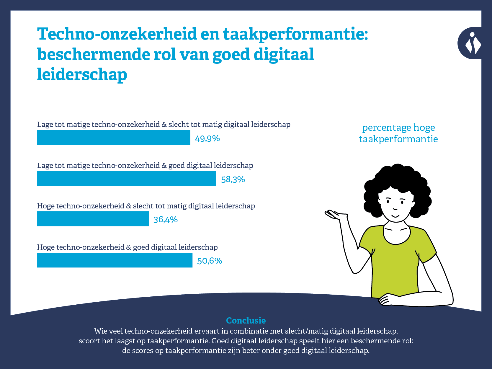 Qua relatie tussen ‘hulpbron’ en ‘outcome’ zien we dat respondenten die aangeven goed digitaal leiderschap te ervaren, beter scoren op de outcome taakperformantie en dit vooral bij hoge techno-onzekerheid. Voor mensen die goed digitaal leiderschap ervaren, lijkt het bijvoorbeeld niet uit te maken of ze lage of hoge techno-onzekerheid ervaren (zie grafiek). Dit is anders wanneer ze laag tot matig als score geven op digitaal leiderschap: als zij tegelijk hoog scoren op techno-onzekerheid, rapporteren ze een minder goede taakperformantie.