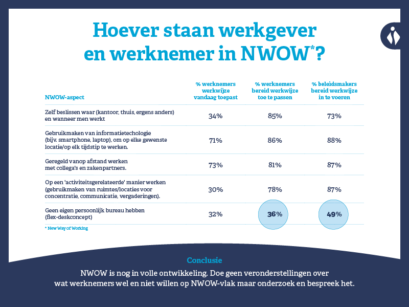 De studie toont uit dat het basisconcept van het hybride werken al ingeburgerd is. Bij de werknemers geeft meer dan 70% aan dat ze gebruikmaken van informatietechnologie (zodat ze op elke locatie of op elk tijdstip kunnen werken) en geregeld vanop afstand werken. Voor een aantal afgeleide concepten is dat echter veel minder het geval. Zo beslist slechts 34% zelf waar en wanneer ze werken, werkt slechts 30% activity-based – wat betekent dat de activiteit bepaalt op welke locatie of in welke ruimte we werken – en past slechts 32% het systeem van flex-desks toe. Opvallend is dat er een grote bereidheid is bij de bevraagde werknemers (variërend tussen de 78% en 86%) om deze concepten met betrekking tot het nieuwe werken toe te passen, met één grote uitzondering: slechts 36% is bereid zijn eigen bureau op te geven in ruil voor een flex-desk systeem.”