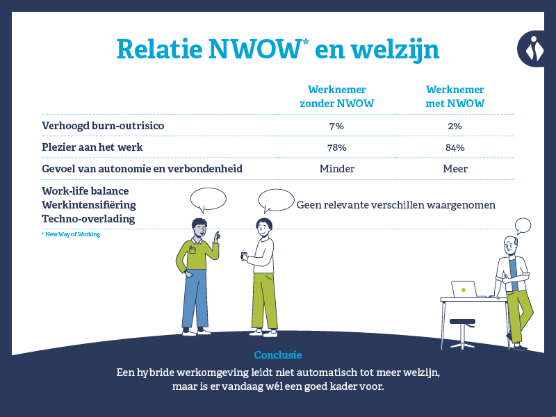 Uit de studie blijkt dat werknemers met een hoge mate van hybride werkregeling – dat wil zeggen: een flexibele werkregeling waarin werknemers tijd en plaats van hun werk kunnen bepalen, terwijl ze ondersteund worden door elektronische communicatie – een lager risico op een burn-out lopen en meer plezier in het werk ervaren. Van de personen die helemaal geen of slechts een beperkte flexibele werkregeling hebben, heeft 7% een verhoogd burn-out risico en beleeft 78% plezier aan het werk, terwijl personen die met een sterk hybride-gerichte werkregeling daar significant beter op scoren: slechts 2% loopt een verhoogd burn-outrisico en maar liefst 84% beleeft werkplezier. Ook stelt de studie vast dat mensen met een hoge mate van hybride werkregeling enerzijds meer autonomie en anderzijds meer verbondenheid ervaren.